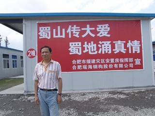 吳銀同——公司貨車司機,吳銀同是我公司最早援建四川災區(qū)最早出發(fā)的員工,5月23日下午,他載著瑤海鋼構第一批援建材料在省建設廳組織的出發(fā)儀式上,帶 著公司全體員工的深情厚誼奔赴四川災區(qū)。在整個援建過程中,前期他一直負責公司材料運輸,從合肥到都江堰建設工地,單程就需要兩天兩夜,為了在最短時間內(nèi) 將材料運送到施工現(xiàn)場,保證現(xiàn)場正常安裝,吳銀同在路上從不休息,兩個人輪流開車,餓了就啃點方便面或隨便買點吃,確保建設材料在第一時間運送到現(xiàn)場。后 期材料運輸完畢后,他又留在施工現(xiàn)場負責各個工地之間倒貨,在工地上,由于缺少裝卸工,吳銀同經(jīng)常是即充當司機,又充當裝卸工。一車五六套安置房的材料, 經(jīng)常是他一個人負責裝卸,對于這些工作,他從來沒有抱怨過,總是默默地奉獻著。