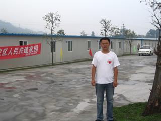 夏源——我公司行政副總暨抗震救災施工現(xiàn)場總指揮,他于5月24日,第一時間趕赴四川災區(qū),是我公司第一位到達都江堰援建場地的高層管理人員,夏總在災區(qū) 一呆就是兩個多月,在這兩個多月里,他帶領一個由管理人員和專業(yè)技術人員組成的團隊,全權負責現(xiàn)場的技術、質量、進度、安全、宣傳、后勤、協(xié)調(diào)、調(diào)配等工 作。