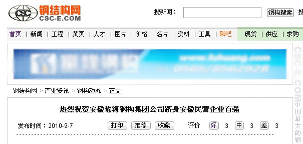 9月6日,鋼構(gòu)行業(yè)知名網(wǎng)站——中國鋼結(jié)構(gòu)在線在首頁顯要位置發(fā)布了題為“熱烈祝賀安徽瑤海鋼構(gòu)集團(tuán)公司躋身安徽民營企業(yè)百強(qiáng)”的行業(yè)新聞。9月7日,中國最大的鋼結(jié)構(gòu)門戶網(wǎng)站——鋼結(jié)構(gòu)網(wǎng),也對(duì)此事進(jìn)行了全面報(bào)道。這既是對(duì)我公司取得成績的肯定和鼓勵(lì),更標(biāo)志著我公司的迅猛發(fā)展已經(jīng)引起了業(yè)內(nèi)的普遍關(guān)注。