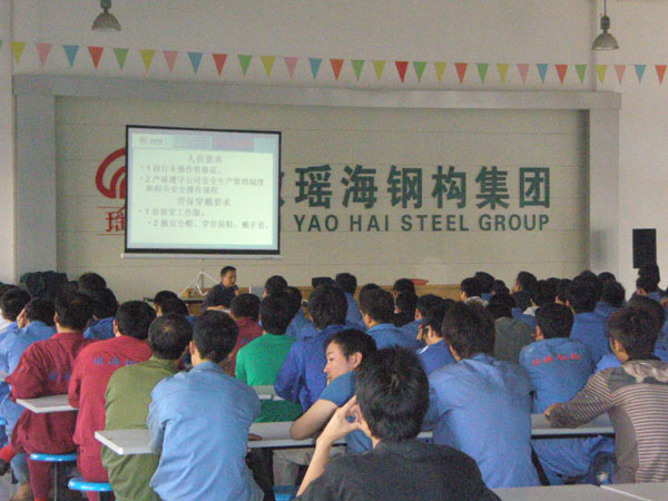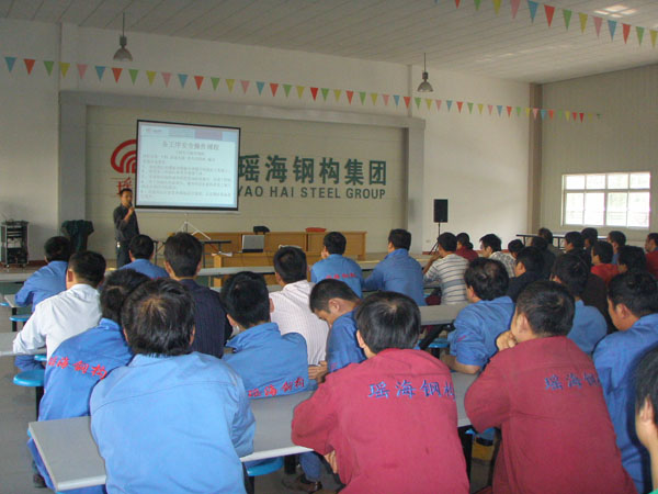 2011年10月10日,由公司質安部組織的安全生產培訓會議在公司多功能廳如期舉行,質安部經理高健主持培訓。生產部全體員工參加了此次的培訓,培訓內容主要針對在生產過程中的操作要求、操作規程以及注意事項。如下料車間要求在上崗前必須穿工作服、戴工作帽、穿勞保鞋、戴手套以及防護口罩,同時嚴格按照操作規程進行操作以確保安全。剪板車間必須要有專人負責管理,開機時必須先空轉一個循環,在確保一切正常的情況下再進行下步操作。鉆床車間必須檢查是否有鉆夾頭鑰匙或斜鐵插在主軸上;工件必須夾緊,鉆孔時不可用手、棉紗或用嘴吹來清除切削,必須用毛刷清除。同時對于氣保焊班組、拋丸組等相關的操作規程和注意事項都給予一一講解。最后針對行車的安全操作及注意事項,高經理給予詳細介紹:1、超過額定負荷不吊,2、工作場地昏暗,無法看清場地或指揮不明不吊,3、吊繩和附件捆縛不牢,不符合安全要求不吊,4、行車吊掛重物直接進行加工的不吊,5、歪拉斜掛不吊,6、工件上站人或放油活動物品的不吊,7、氧氣瓶、乙炔罐等具有爆炸性危險的物品不吊,8、帶棱角、快口未墊好的物件不吊,9、重量不明不吊,埋在地下的物件不吊,10,管理人員違章指揮不吊。