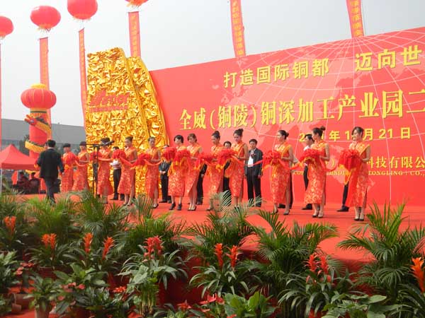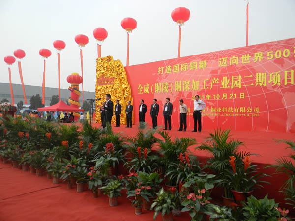 2011年10月21日上午九點整,由我司承建的全威(銅陵)銅業科技有限公司二期廠房舉行開工儀式。銷售總監凌必健及合肥明遠建設工程有限公司總經理王昌俊參加了此開工儀式。全威(銅陵)銅業科技有限公司由正威科技(深圳)有限公司與香港正威國際集團、鴻瑋科技集團有限公司在安徽省銅陵市經濟技術開發區共同投資設立的一家中外合資企業,公司注冊資本12100萬港元。該項目是安徽省“861計劃”重點項目,設備制造商及設計方均為國際、國內一流知名企業。生產達產后產值超百億,產能在行業內居中國和世界前列。全威銅產業園系列項目總用地面積逾60萬平方米,建筑面積超過30萬平方米, 該項目是全威(銅陵)銅業科技有限公司在銅陵全威工業園內實施的系列銅加工項目之一,項目建成后,對推進安徽省工業化進程,促進地方經濟發展需要具有重大的戰略意義。