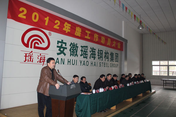 2012年2月9日,瑤海鋼構一年一度工作動員大會在公司多功能廳隆重召開,董事長凌紅兵、分管領導及公司全體員工參加了會議,會議由總經理助理楊雄主持。會議分二部分進行,一是由公司董事長凌紅兵作動員報告,二是分管系統代表做表態發言。首先凌總對春節期間奉獻在一線崗位的員工表示感謝,隨后對2011年工作進行了回顧和總結,對2012年的工作進行了安排和部署。凌總強調,“2012年,是我公司十二 •五規劃的第二年,也是我公司快速發展的一年,目標緊,任務重,如何完成目標任務,是我們在座的各位必須思考的問題,靠現有的輕鋼產業很難完成,怎么辦?所以第一,我們必須啟動400畝重鋼基地和300畝玻璃幕墻產業,加快步伐,加快腳步,方能趕上同行的步伐、時代的腳步。二是從小事做起,有責任心,能吃苦且專業要扎實,以此列舉了2011年工作典型,如工程部副經理魏達猷、二廠廠長李強等,正是因為他們的努力,能吃苦才使得他們所負責的工程和生產得以順利發展。”三是開展科學考評,合理的管理體系,通過考評拉開差距,形成你追我趕的良好局面。四是全面發展,早日實現十二•五規劃目標。接著銷售公司總經理周志偉對2012的工作做了表態,在肯定過去一年成績的同時表示過去已經歸零,面對新的一年任務,雖然有壓力,但壓力和動力并存,同時對目標任務進行了細化,并強調企業要生存一定要有差異化。工程系統負責人司貴武也從安全質量的角度對2012年度工作進行表態發言。最后,總經理助理楊雄做最后的動員,一是要準確領會董事長講話精神,二是要確定集體貫徹落實的措施,三是及早行動,全力抓好第一季度各項工作。