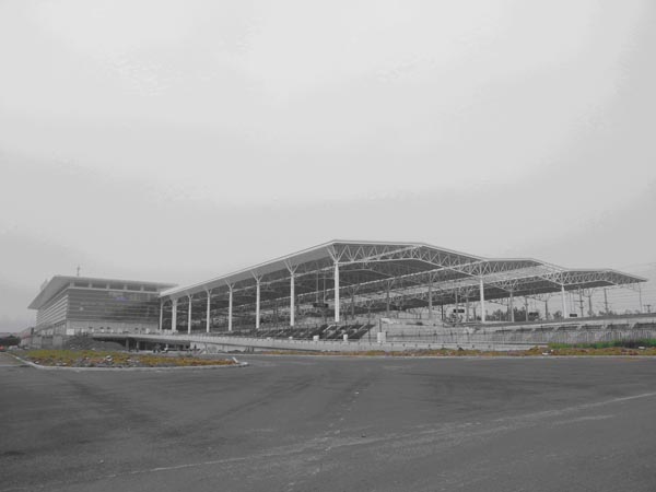 4、京滬高速鐵路Ⅳ標段蚌埠南站站臺雨棚鋼結構工程:京滬高速鐵路蚌埠南站站房由桁架、鋼管柱、檁條、系桿、支撐組成,桁架采用三角形鋼管結構體系,鋼管之間采用直接相貫的焊接節點。邊跨柱為雙鋼管格構柱。桁架最大跨度為33米,縱向為159米。有組織排水,設計使用年限為50年,建筑結構安全等級為二級,七度設防,抗震設防類別為標準設防。蚌埠南雨棚總長421米,寬121.15米,沿雨棚縱向共有26條軸線,橫向有4條軸線,鋼結構覆蓋面積51176.5㎡,雨棚全長范圍 內設置2道伸縮縫,位于P7、P19軸。雨棚為鋼管桁架體系,桁架上弦中心線高度16.7米。平行于股道方向柱距為18米,天橋處為21米,垂直股道方向柱跨分別為41.65米,33.50米和43.00米。
