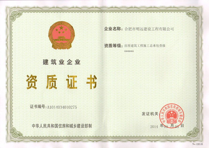 本報訊:來自資質辦的好消息,經住房與城鄉建設部審核批準,安徽瑤海鋼構集團所屬合肥市明遠建設工程有限公司榮獲房屋建筑工程施工總承包壹級資質。房屋建筑工程施工總承包壹級資質的取得標志著明遠建設公司在建設范圍和公司管理上又邁上了一個新的臺階,對整個集團公司的發展具有里程碑式的重大意義。