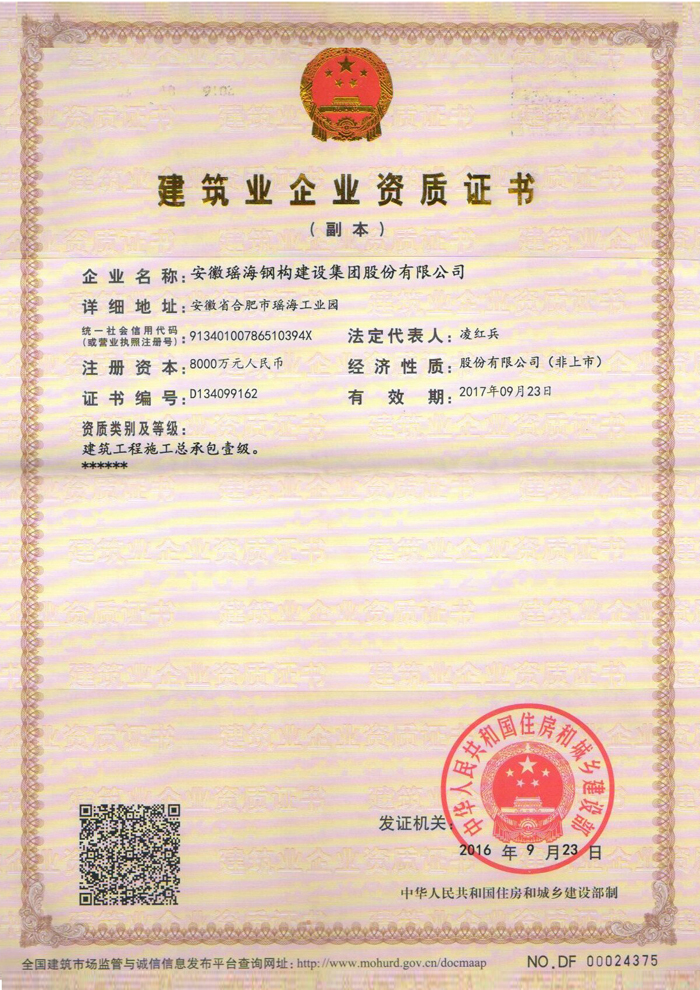 安徽瑤海鋼構建設集團股份有限公司獲得房屋建筑施工總承包一級