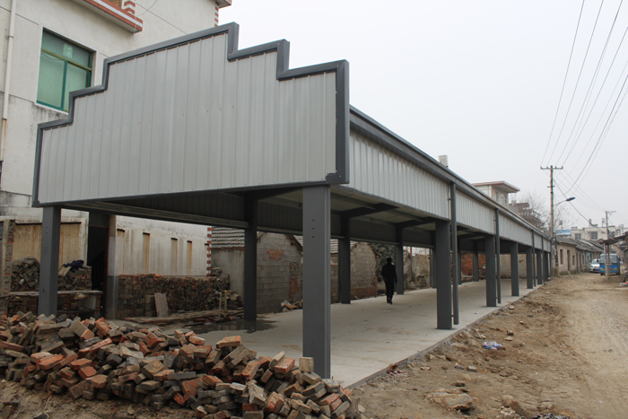 此次幫扶的項(xiàng)目為巢湖市烔煬鎮(zhèn)花集居民菜市場,該菜市場項(xiàng)目跨度6米,長度54米,檐口高度3.6米,總面積為324平方米,造價(jià)約20萬元。建成后極大地滿足當(dāng)?shù)鼐用裆睿≡擁?xiàng)目采用徽派馬頭墻設(shè)計(jì)、外掛彩板天溝及彩板軋制排水管,馬頭墻采用瓦青色,墻面為白色為標(biāo)準(zhǔn)的徽派建筑風(fēng)格。