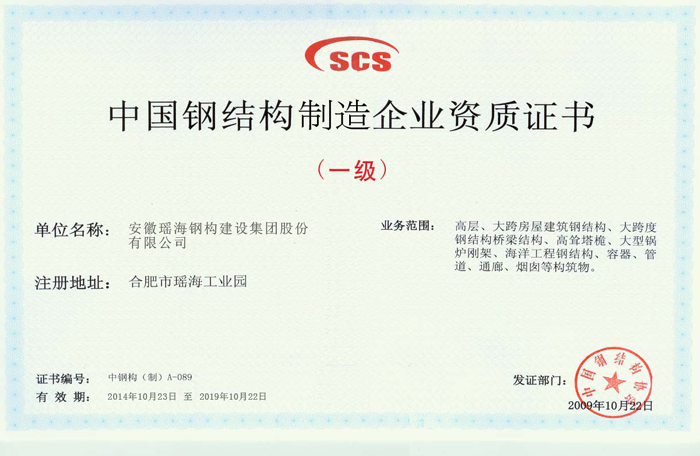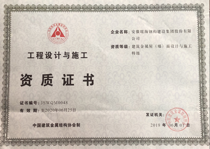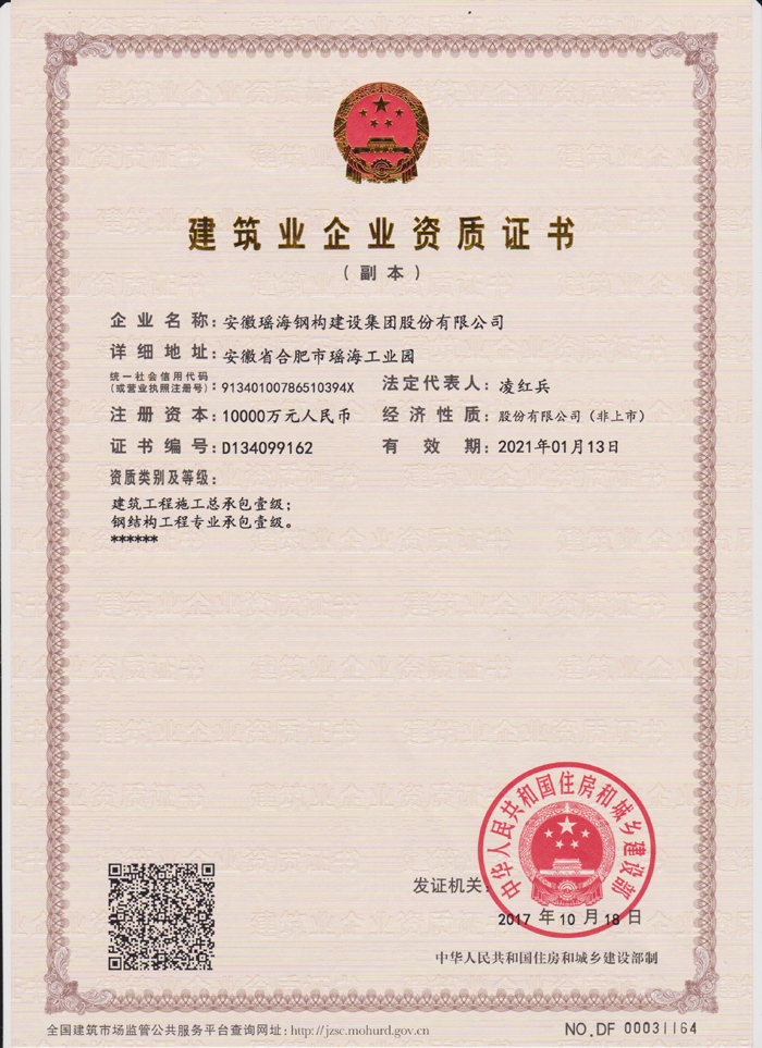 在獲得榮譽的同時,瑤海鋼構的資質隨之不斷夯實和升級:2014年9月,合肥市明遠公司房屋建設施工總承包貳級資質升級為壹級資質,2015年7月,安徽瑤海鋼結構建筑設計研究有限公司獲得建筑行業(建筑工程)乙級.....,截止到目前安徽瑤海鋼構建設集團擁有房屋建筑施工總承包壹級資質、建筑行業(建筑工程)設計乙級、鋼結構工程專業承包一級資質、鋼結構制造一級資質、建筑金屬屋(墻)面設計與施工特級、樁基基礎二級資質,消防設施工程專業承包二級、市政公用工程施工總承包三級。