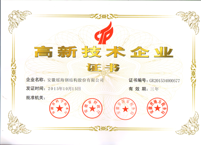 在工程業績遍地“開花”之時,榮譽也接踵而來:2010年6月,公司獲安徽民營企業百強稱號,2011年3月,我公司生產的瑤海牌房屋鋼結構產品蟬聯“安徽名牌產品”稱號,同時我公司“瑤海及圖”獲安徽省著名商標,2011年11月,我公司獲升“安徽省企業技術中心”稱號,2013年4月,彩板車間榮獲“安徽省工人先鋒號”榮譽稱號,2013年9月《瑤海鋼構報》、瑤海鋼構網站獲全國建筑行業優秀報紙、優秀網站稱號,2015年4月,公司獲中國建筑鋼結構行業50強企業稱號,9月,瑤海及圖商標獲得中國馳名商標,11月,瑤海鋼構被評定為“高新技術企業”,2016年1月,瑤海鋼構獲得新站區“工業規模十強”企業,2016年12月,瑤海鋼構獲安徽省專精特新中小企業稱號,2018年4月,壽縣瑤海鋼結構獲得壽縣人民政府表彰,2018年4月,瑤海鋼構榮獲合肥市百企幫百村先進單位。