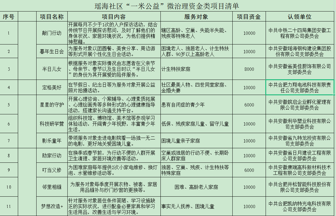 近日,新站高新區瑤海社區黨委在安徽合肥技師學院大禮堂召開“一居一品”黨建品牌推介暨“近鄰”微治理項目認領儀式,瑤海鋼構參與“近鄰”微治理項目認領,捐贈10000元愛心資金,定向配套于微治理項目:暮年生日會。為困境老人、獨居老人、計生特扶人群、90以上高齡老人以團圓餐、美食分享、周邊游等形式開展個性化生日會活動。
