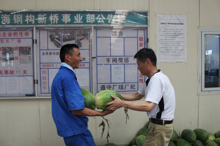 上午10時,1600斤新鮮西瓜準時送到新橋事業部車間,隨后按照各班組依次將西瓜分發到每一位員工手中,看著他們美在臉上,甜在心里,頓時感到他們才是最可愛可敬之人,為了瑤海鋼構的生產,為了能按時按質地完成客戶的任務,他們冒著高溫24小時奮戰在第一線,著實令人感動。
