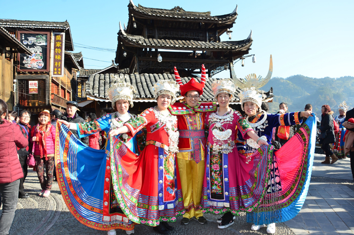 翌日,我們來到西江千戶苗寨,感受了苗族的生活,體驗(yàn)到苗族的風(fēng)情。西江千戶苗寨是一個(gè)保存苗族"原始生態(tài)"文化完整的地方,由十余個(gè)依山而建的自然村寨相連成片,是目前中國(guó)乃至全世界最大的苗族聚居村寨。我們首先來到民族風(fēng)情街,看看當(dāng)?shù)氐奶厣吞禺a(chǎn),并選購(gòu)著代表民族產(chǎn)品的紀(jì)念品,品嘗著當(dāng)?shù)氐男〕浴V形鐣r(shí)分觀看了苗族歌舞表演,華麗的服飾,歡快的歌舞和這美麗的愛情故事都能使你更加了解苗族人民! 苗族古歌演唱,演唱者全是寨中的老人,用苗族古語(yǔ)演唱其史詩(shī)般宏大的古歌。隨后體現(xiàn)了苗族的另一個(gè)文化——長(zhǎng)桌宴,只見長(zhǎng)約10米的長(zhǎng)桌一字排開,我們兵分2邊就座,品嘗著獨(dú)具特色的酸魚湯,聆聽著苗寨的祝酒歌,無(wú)不美哉樂哉。
