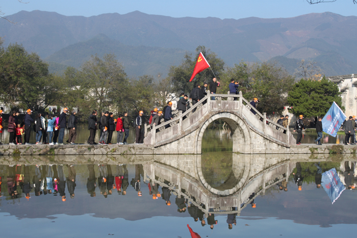 第三站黟縣宏村,宏村始建于北宋,距今已近千年歷史,原為汪姓聚居之地。古宏村人獨出機抒開 "仿生學"之先河,規劃并建造了堪稱"中華一絕"的牛形村落和人工水系,統看全村,就象一只昂首奮蹄的大水牛,成為當今"建筑史上一大奇觀"。全村現保存完好的明清古民居有140余幢。村內鱗次櫛比的層樓疊院與旖旎的湖光山色交相輝映,動靜相宜,空靈蘊藉,處處是景,步步入畫。從村外自然環境到村內的水系、街道、建筑,甚至室內布置都完整地保存著古村落的原始狀態,沒有絲毫現代文明的跡象。造型獨特并擁有絕妙田園風光的宏村被譽為"中國畫里鄉村"。