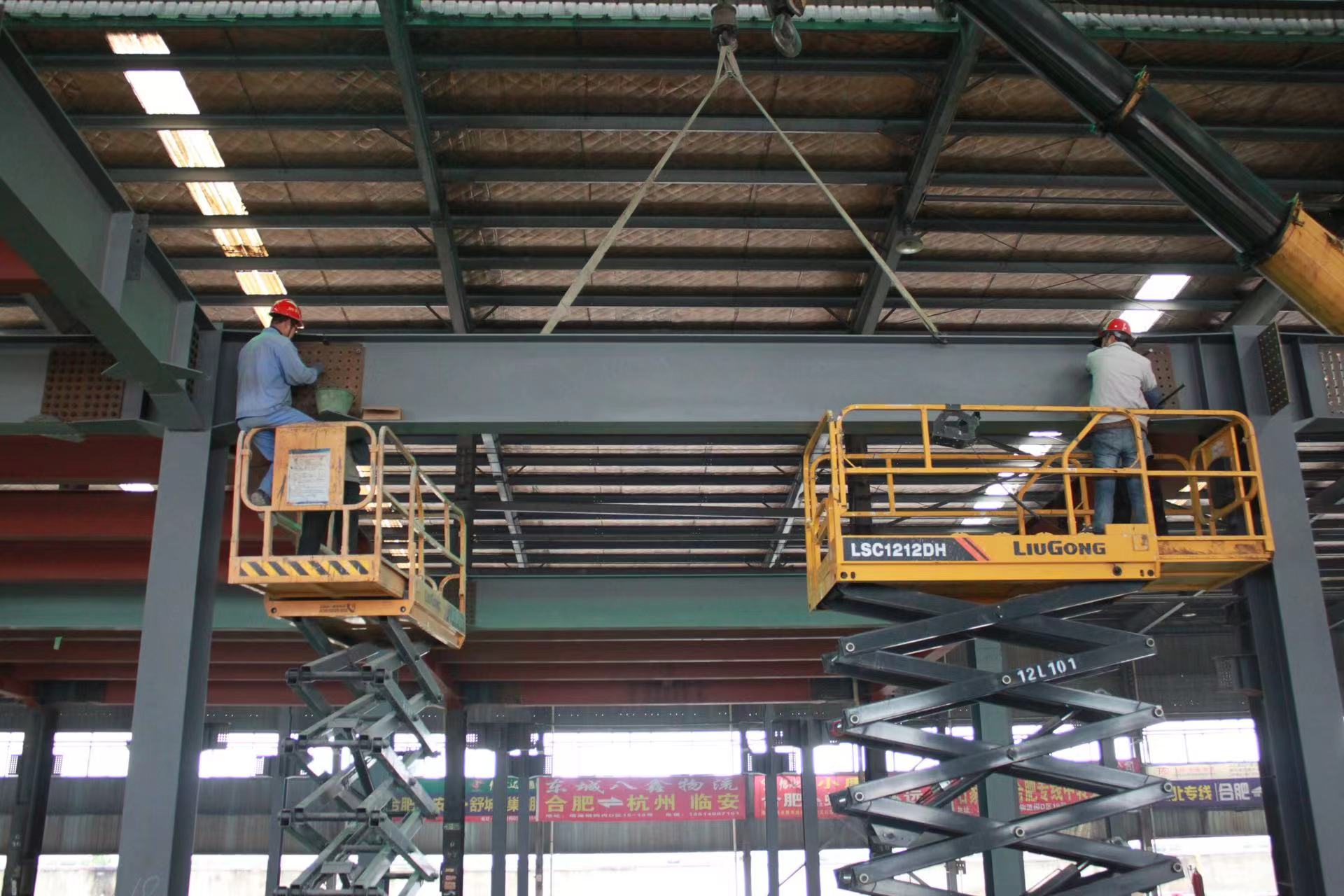 在安徽瑤海新能源汽車城二期廠房內,一幅熱火朝天、實干奮進的畫面徐徐展開。據了解,根據項目進度節點,目前項目正在進行樓層板的搭建階段。物流事業部年前結束外立面就開始進行安裝,目前已完成近一半的裝配工作量,計劃在四月底完成樓承板的搭建工作。搭建樓承板采用的H型鋼,是由新橋生產基地生產加工,這種裝配式鋼筋桁架樓承板免除了現場焊接、綁扎的工序,將一體成型的板材直接鋪設到梁上,然后進行簡單的鋼筋工程,再往里澆灌混凝土,可以承受大量的后期承載力。自原物流園轉型新能源汽車城改造以來,一期市場已初具規模,曾經堆滿貨品的檔口,改造成了門面整齊的汽配展區,停車場內整齊有序地停放了不少新車。